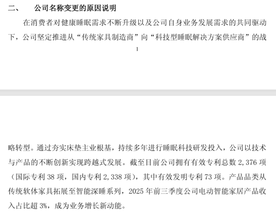 公告显示,截至目前公司拥有有效专利总数2376项(国际专利38 项,国内专利2338 项),其中有效发明专利73项。这些专利的核心价值不仅在于数量,更在于其指向:致力于让产品超越基础的物理承托功能,向感知、交互与智能调节进化。